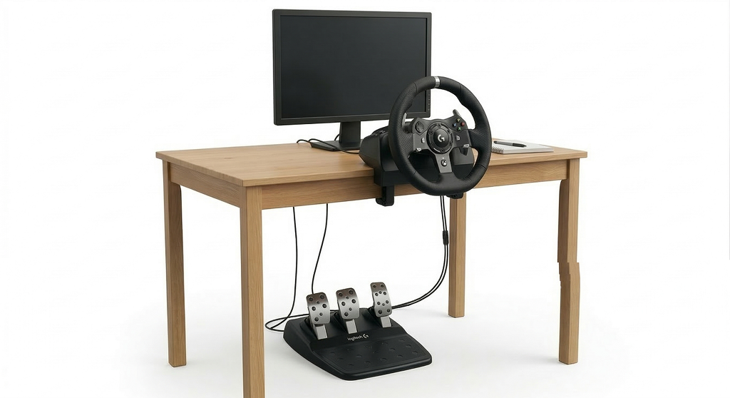 • Steering & Pedals: Logitech G920 Force Feedback wheel with a 3-pedal set (clutch, brake, accelerator). The steering wheel feature peddle shifters that can work with both manual and automatic transmitions. Also, one of the wheel buttons is mapped to work as a parking brake.