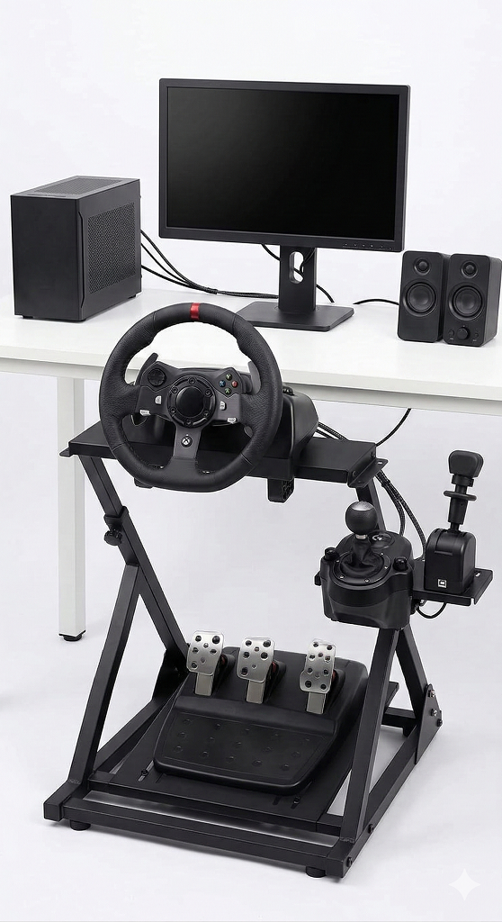 A G920 Logitech steering wheel and pedals based modular stand setup. It comes with a lifetime K53 Simulator license.